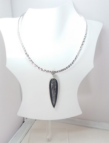 The central is embroidered with a very beautiful Orthoceras 7cm long with silver plated embroidery beads. On the bottom a small black Swarovski crystal spinning top. A rhinestone bail hooks it to the hammered silver-plated torque.
