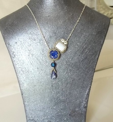 It consists of a central embroidery made with a cabochon square 10 mm color "Royal Blue" from Swarovski. At the top right of the picture is a slightly bluish faceted rectangular mother-of-pearl and two crystal-colored kittens.