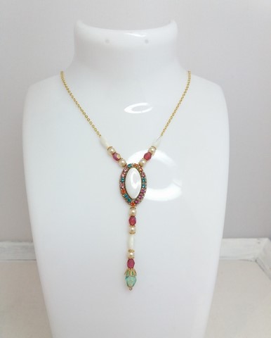 Handmade necklace handmade by me in Native American embroidery. It is composed of a natural mother-of-pearl cabochon surrounded by a bohemian crystal chain. On the bottom a gradient of round Swarovski mother-of-pearl, bohemian facet, natural mother-of-pearl and a glass drop to finish. Small gold-plated flower caps are found on some pearls.