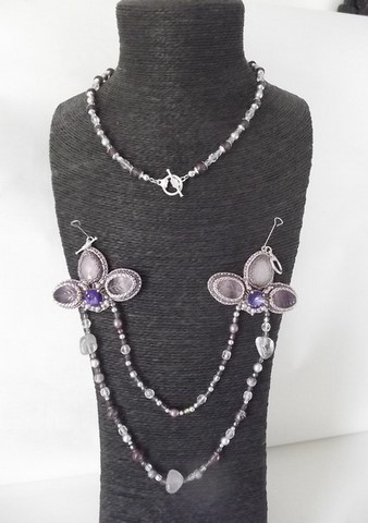 Each half is made with flower in a beautiful Rivoli cabochon center (10mm) of at Swarovski heliotrope color. To right and left of the leaves is a semi-precious stone named Fluorite and on top a drop faceted rose quartz. Around the cabochon Swarovski are pink and gray pearls range swarovski. The set is embroidered with beads miyuki pink metal, violet and ultra violet suede lining. The two rows of beads on the bottom are composed of large amethyst chips, Bohemian crystal in different sizes in shades of pale pink, crystal, glossy amethyst, pearl and Swarovski pearls range Preciosa old rose. The choker is made for its Bohemian crystal amethyst color glossy, crystal and pearls Preciosa in shades of gray. Some beads are decorated with silver plated sheets.