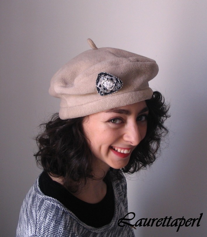 Ce bijou réunit deux techniques travaillées sur mes créations (broderie amérindienne et passementerie). Cette broche peut se porter de deux façons : soit sur un petit chapeau comme vous pouvez le voir sur la photo, soit sur un revers de veste. Pour consulter sa fiche technique qui vous donne le détail des matières premières utilisées c’est ici.