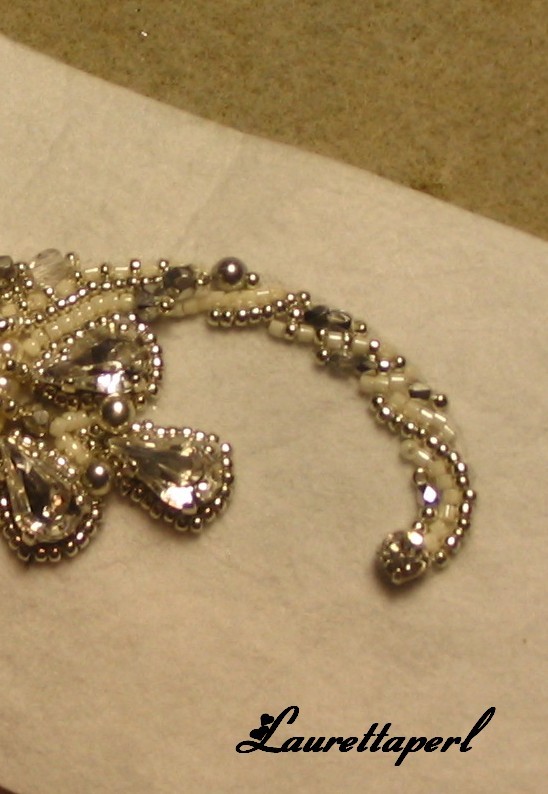 Le tout a été réalisé à l’aiguille en broderie de perles avec de très belles matières premières comme de la nacre, du cristal Swarovski, du cristal de bohème, de la nacre naturelle pour le bracelet ainsi que des estampes; le tout dans des couleurs d’argent, de crème et de cristal naturel.