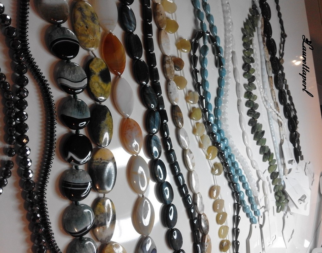 En avant première , voici une première réapro de pierres semi-précieuse pour la réalisation de la future collection du printemps/été….Oeil de tigre bleu, abalone, jade jaune, nacre bleu, coquillage panthère, cristal de roche givré, jaspe d’indonésie (île de java..), jade canadien etc etc OUH……cela fait rêver …..vite vite que le reste arrive pour que je puisse commencer.