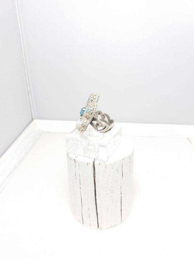 Le support artisanal est très travaillé au niveau de l’anneau et en plaqué argent sur laiton réglable.