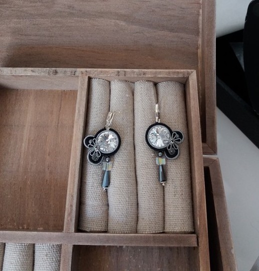 Boucles composées d’un cabochon en cristal Swarovski de couleur« cristal » de 12mm gamme rivoli travaillé avec de la soutache couleur noire et gris perle. Sur le côté une fantaisie réalisée pour celle du haut avec une nacre « grey » de Swarovski en 3mm et d’une perle ronde « cristal » de Swarovski en 4mm pour l’arabesque du bas. Entre les deux une fleur en métal « gunmétal ».