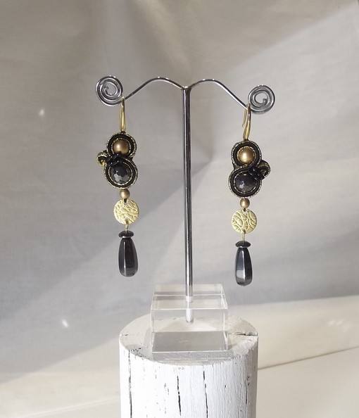 Les deux perles qui forment une arabesque sont une hématite facetée et une perle tchèque préciosa or patiné. Toutes deux travaillées avec de la soutache or et noire.