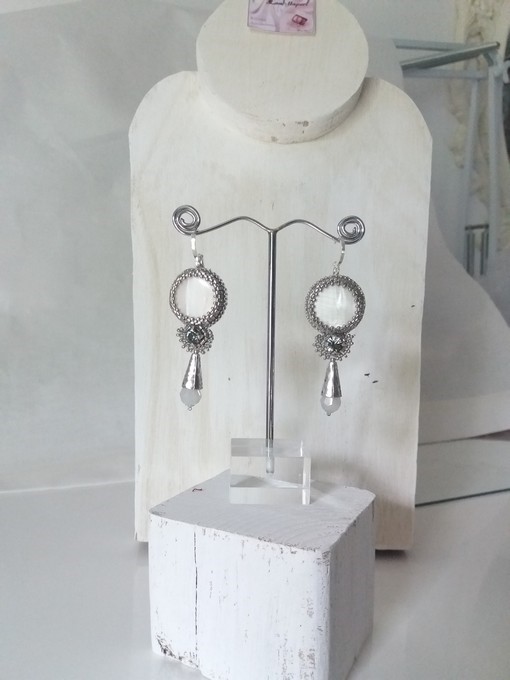 Boucles composées de nacre, cristal Swarovski, perle de verre opale, calotte métal et plaqué argent.