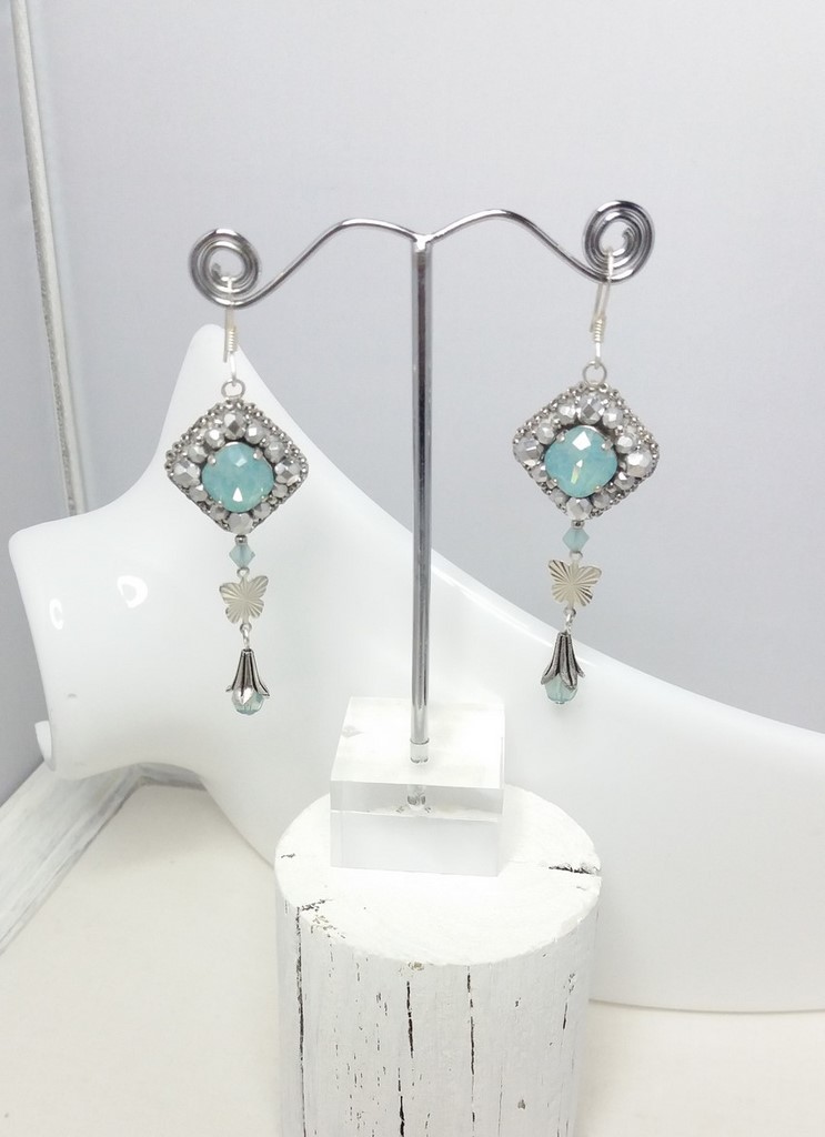 Au centre un cabochon carré de 10 mm Swarovski couleur « Pacific opal » dans son serti.