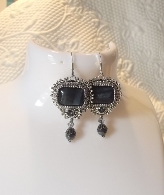 Boucles artisanales fait main par mes soins. Au centre un cabochon en œil de tigre bleu de 10x14 mm. Sur le bas centré un chaton en cristal de couleur silver nigth. La pampille est constituée d’une toupie swarovski cristal comet silver ligth et d’une perle ronde facettée en hématite surmontée d’une calotte en argent vieillie. Le tout est entièrement brodé avec des perles en plaqué palladium et galvanisée.