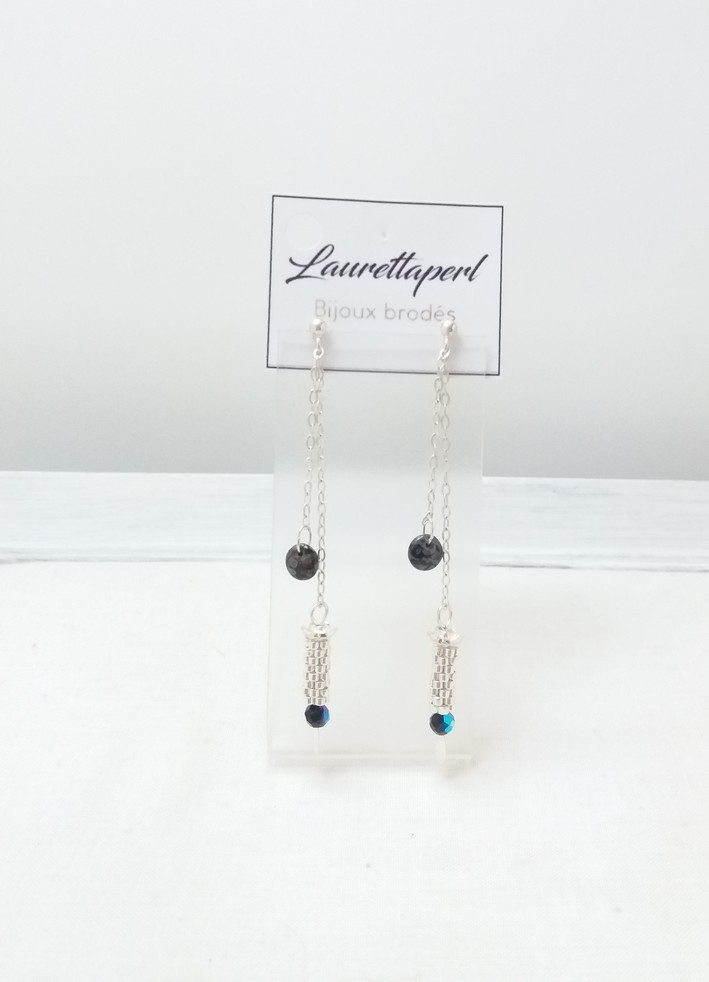 Boucles à 2 chaînes. L’une avec tube brodé en perle de verre plaqué argent et sa boule de cristal Jet AB. L’autre avec sa pastille en perle préciosa.