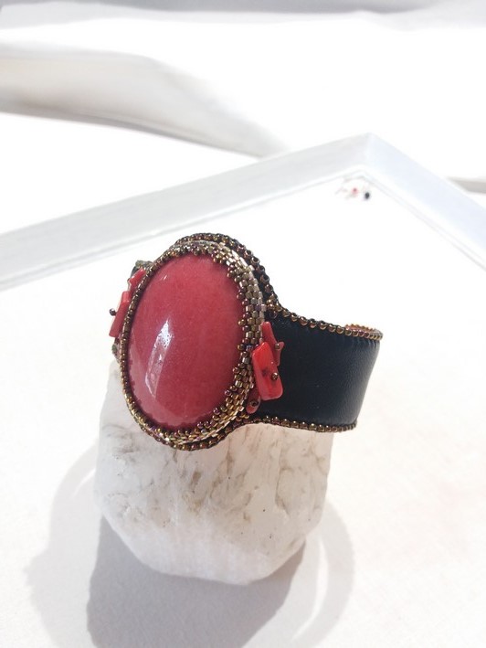 Travail en broderie Amérindienne réalisé sur cuir avec au centre un cabochon en pierre semi précieuse rouge corail serti avec des perles de verre « gold irisé métallique ». Sur les côtés des petits éclats de corail et des petites toupies en cristal Swarovski hématite ainsi que des perles rondes en corail.