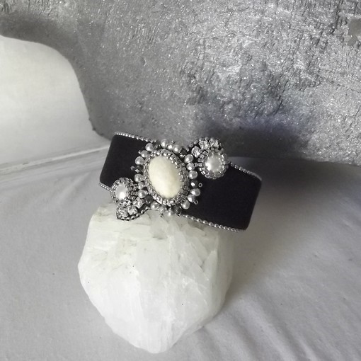 Bracelet artisanal fait main par mes soins. Au centre un cabochon en pierre semi-précieuse nommé Riverstone entouré de cristal de bohème hématite et argent ainsi que de mini gouttes. De chaque côté il y a des cabochons ronds en nacre Swarovski et sur leur côtés des petits chatons en cristal. Le tout est travaillé sur de la suédine noire et brodé avec des petites perles en plaqué palladium. Le support où repose la broderie est en laiton doublé de suédine noire elle aussi.