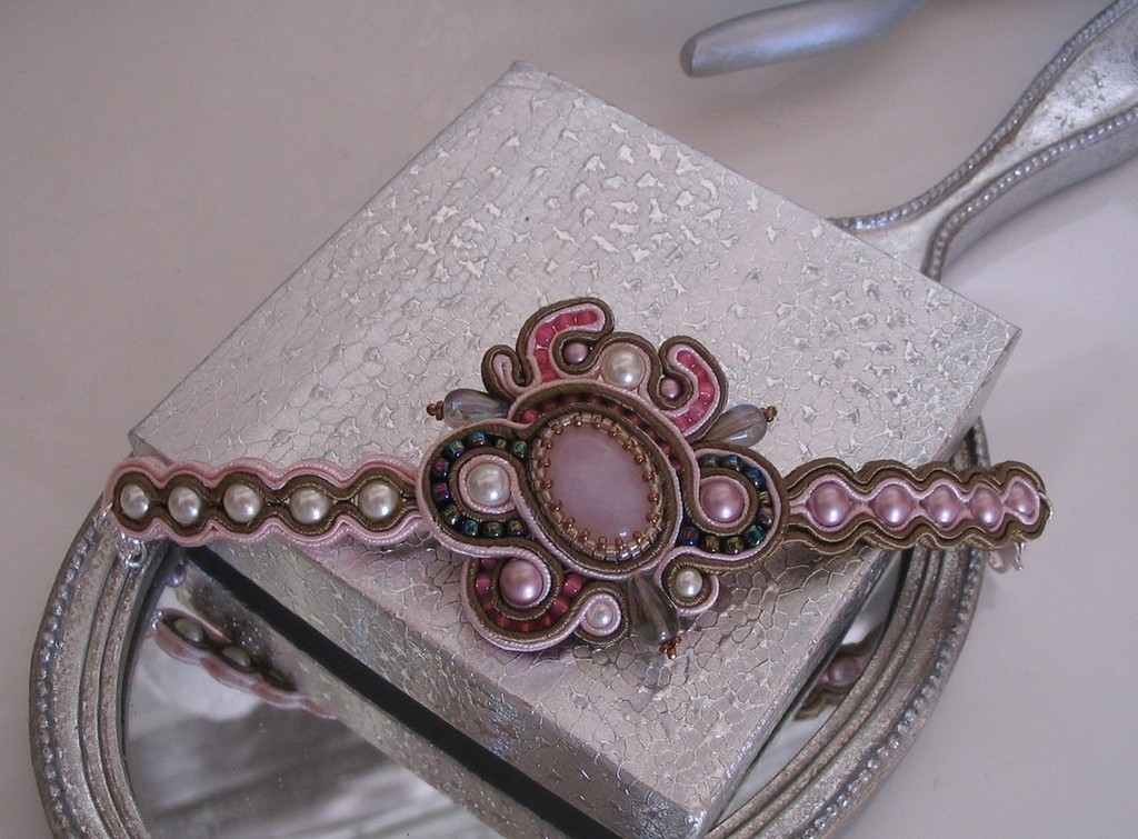 Bracelet entièrement brodé par mes soins composé au centre d'un cabochon en quartz rose. Autour se trouvent des gouttes en verre, de la nacre Swarovski et des petites perles délicat. Travaillé avec de la soutache. Le bracelet est brodé avec de la soutache et des nacres Swarovski. Un côté est crème, l'autre en nacre rose antique de swarovski. Fermoir et anneaux en plaqué argent.