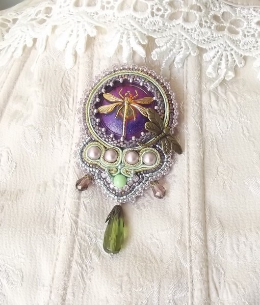 Pièce principale : un bouton de verre artisanal avec au centre une libellule sertie en perle de verre dans les tons de violine dorée. Sur le bas des nacres rose Swarovski et une perle preciosa vert pastel sont travaillées avec de la soutache vert anis et métal or. En bas de la perle verte, des petits strass rose. Sur le côté droit à l’image une libellule en métal bronze est rajoutée sur les broderies. La grosse goutte vert olivine AB ainsi que les deux petites améthyste sont en cristal de Bohème surmontées de calottes en bronze.