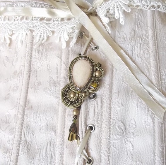Le cabochon principal en forme de goutte est une calcite jaune pâle sertie avec des miyuki en verre dans les tons de vert doré. Tout le reste de la broche est ensuite travaillé avec de la soutache vert olivine et vieux or. L’arrondi sur le côté à gauche de l’image est formé avec des perles filigranées bronze et une perle vieux or de la marque preciosa. A droite ce trouve enfermé dans le ruban de soutache à la fois des perles preciosa de différentes dimensions mais aussi un très beau carré en cristal swarovski de couleur jaune.