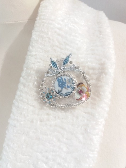 Broche brodée à l’aiguille réalisée avec la technique de passementerie et Amériendienne.