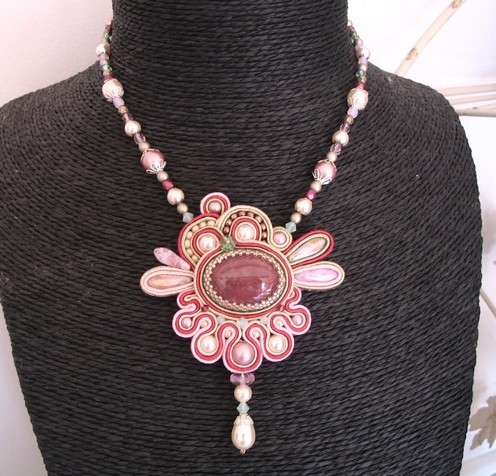 Collier entiérement brodé par mes soins avec de la soutache, technique de passementerie. Au centre se trouve un cabochon en Rhodonite. De chaque côté se trouve des dagues de verre tchèque. Sur le bas, de la nacre Swarovski dans les tons de rose et crème. Sur les arabesque du haut se trouve une petite fleur Swarovski couleur vert péridot. La goutte finale est une nacre Swarovski ainsi que les perles du dessus. Le tour de cou est réalisé avec du cristal de bohème et nacre et cristal Swarovski. Les calottes sont en plaqué argent et l'arrière du collier est réalisé avec des dagues serties de soutache pour rappeler le collier. Le fermoir et sa chaînette sont en argent 925m. Doublure en ultra suedine pour un contact doux sur la peau.