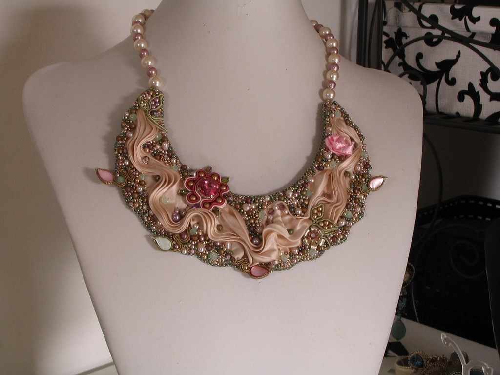Le plastron est entièrement brodé à l'aiguille avec au centre du shibori silk ribbon (soie). La fleur est en passementerie avec un cristal rivoli rose Swarovski. Des petites feuilles sont aussi formées grâce à des petites nacres Swarovski de couleur or et de la soutache tilleul. Le collier est brodé de milliers de petites perles comme des perles de verre, du cristal et nacre Swarovski, du cristal de bohème, de la perle d'eau douce. Le tour de cou est réalisé avec 2 dimensions de perles de nacre Swarovski rose et crème. Les roses sont ornées de calottes en plaqué argent. Le fermoir et la chaînette de réglage sont en argent 925m. La doublure est en ultra-suedine pour un contact doux sur la peau.