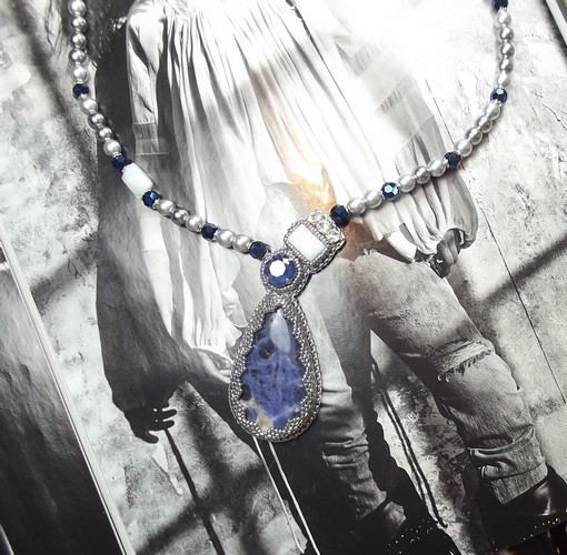 Le tour de cou est réalisé avec des perles de la gamme « Préciosa » (république tchèque) en bleu métallique et grise avec sur un des côtés une nacre facettée comme pour la broderie de base.