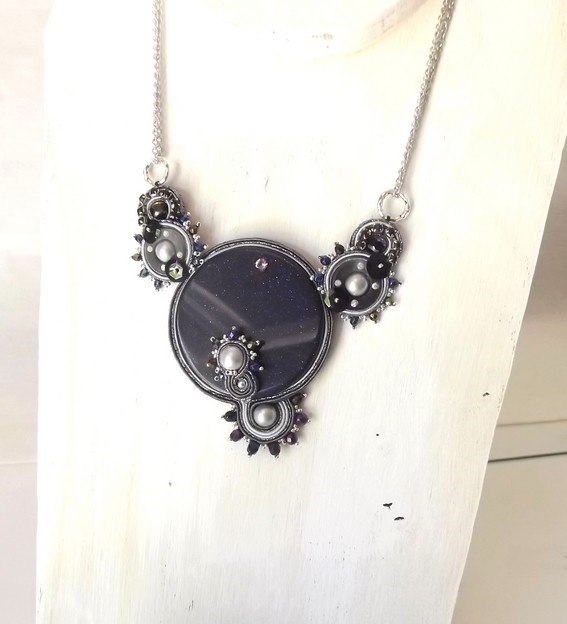 Le collier est constitué au centre d'une grosse pierre en blue sand stone de 50mm de diam. De chaque côté un travail de passementerie à l'aiguille avec des intercalaires strassées, perles préciosa, cristal de bohème irisé et soutache de 3 couleurs différents : gris perle, métallique et gris clair.