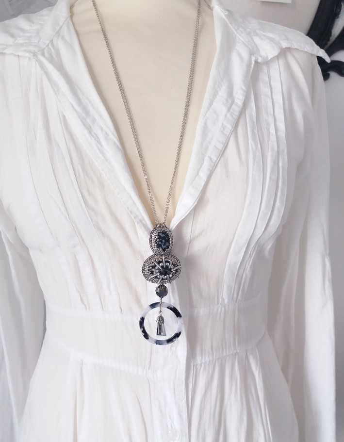 Composées d’Obsidienne Neige de 2 tailles, cristal de Bohème argent, de perles de la gamme czechmates « crescent argent » et d’un pendentif rond en acetate de cellulose « écaille de tortue » avec sa goutte en cristal et sa grosse perle ronde en Swarovski .