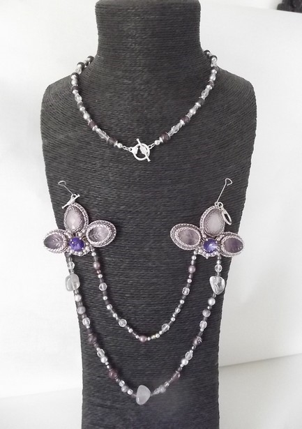 Matériaux utilisés : pierre semi-précieuse, cristal Bohème et Swarovski, perle préciosa.